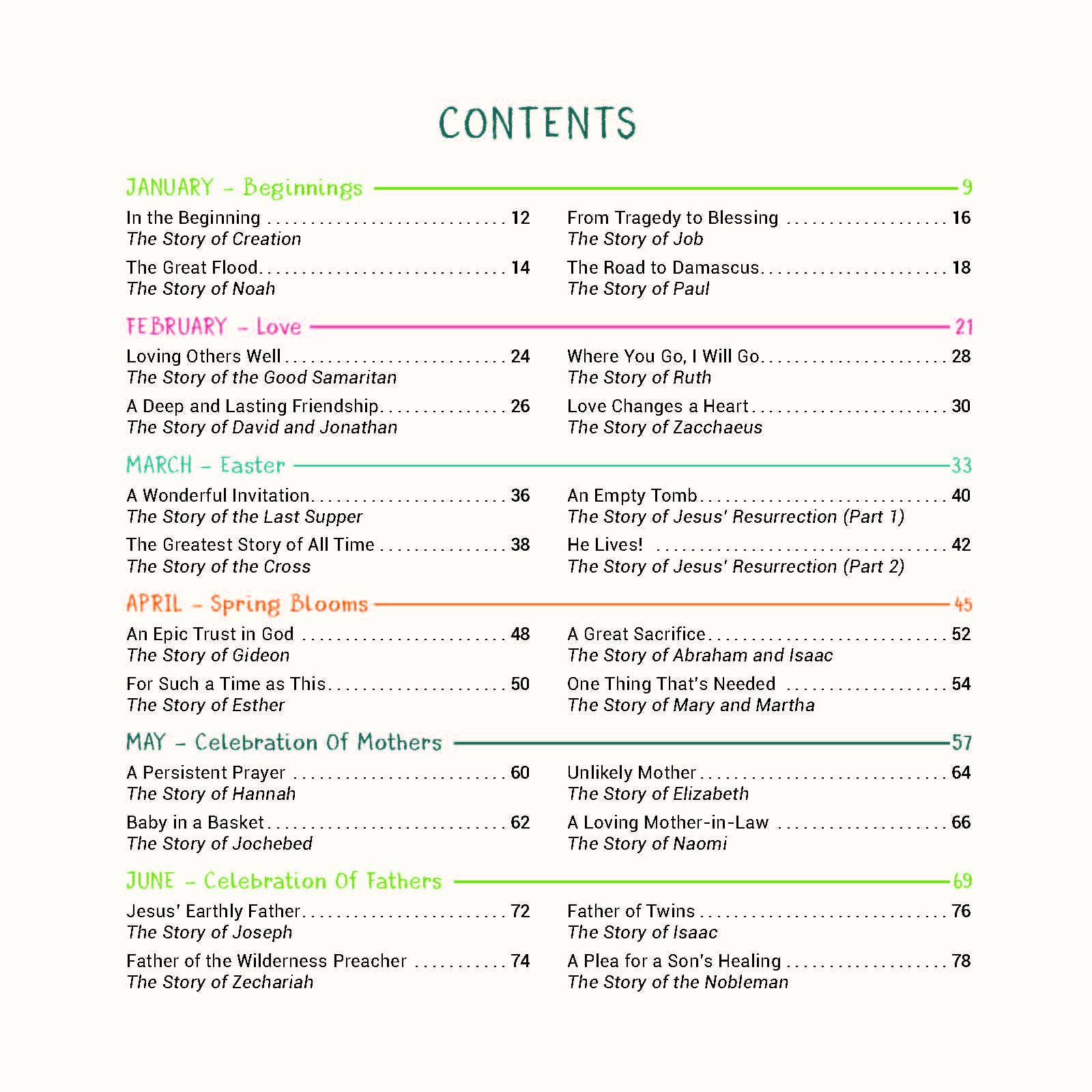 The stories are arranged into monthly themes that relate to a specific month of the calendar year: