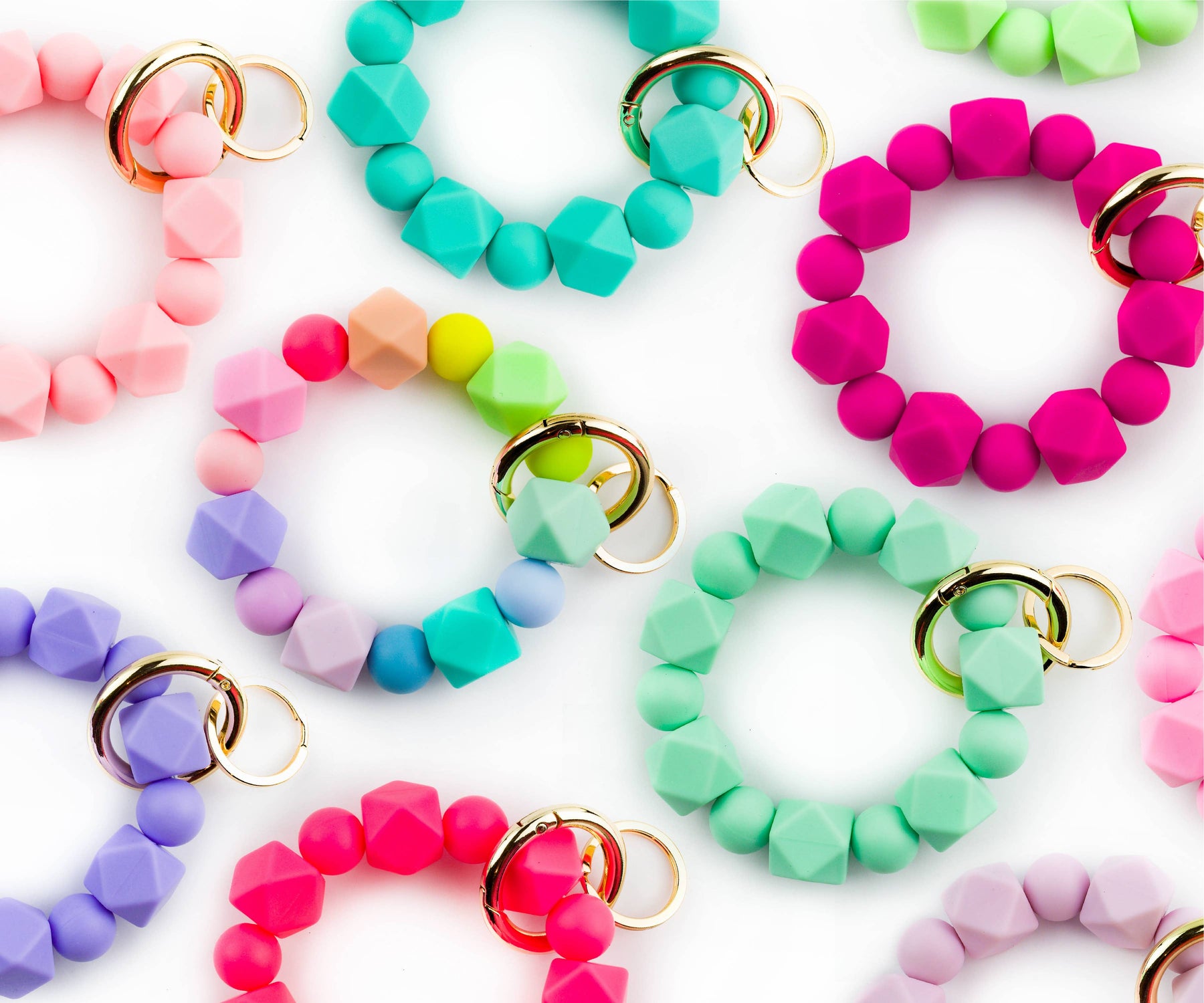 Brighten your day with our vibrant silicone bead wristlet keychains! Perfect for adding a pop of color to your keys or accessorizing your bag. Material: Silicone beads & gold hardware Packaging: Branded tag Size: 3.5" Diameter